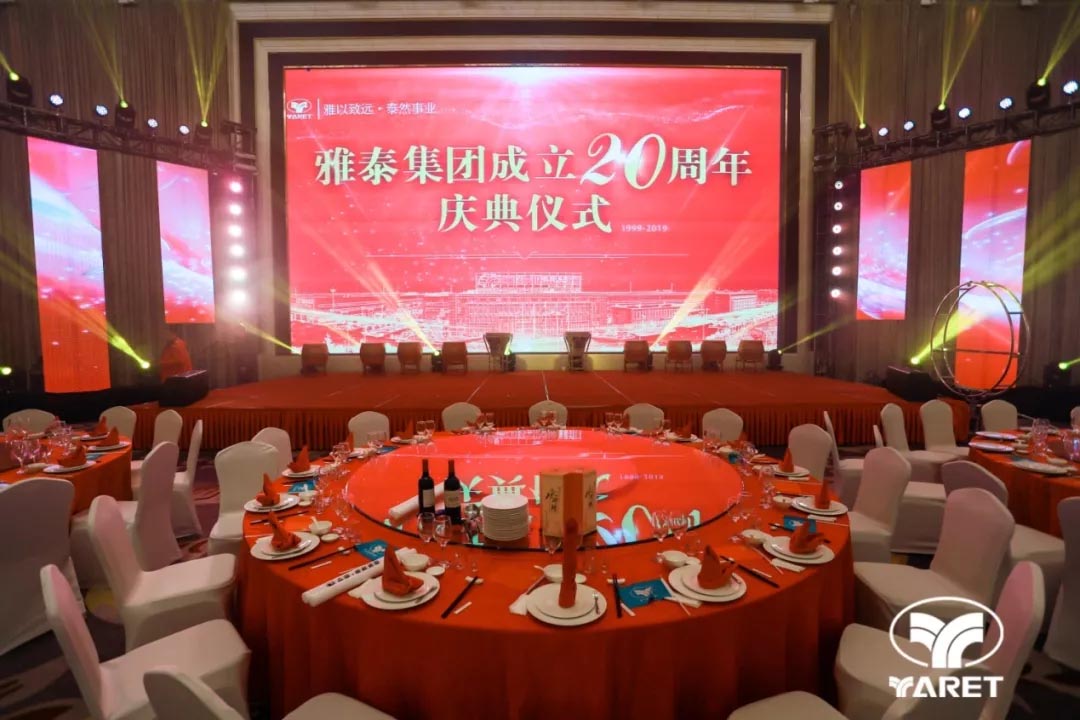 2019年12月18日17時(shí)18分,雅泰集團(tuán)二十周年慶典儀式及晚宴于江蘇省宿遷市恒力國(guó)際大酒店隆重舉行,千余人歡聚一堂,共同祝福雅泰二十歲生日快樂!